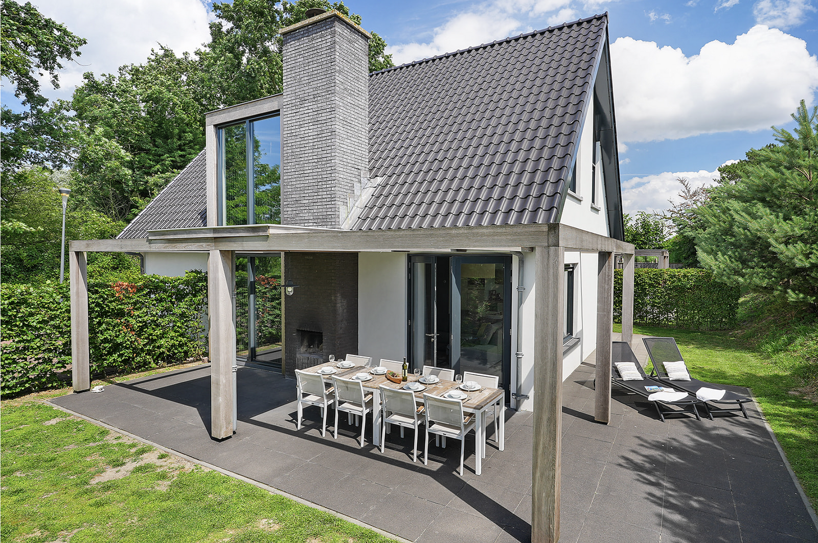 The bright villas are tastefully and comfortably furnished. You have plenty of space in an open living and dining room with a comfortable XXL sofa, a large dining table and a well-equipped kitchen. In 4 bedrooms, some with their own shower and washbasin, everyone can enjoy a well-deserved night's sleep on double box-spring beds. The garden is south-facing and all seating areas are partially covered, there is an outdoor fireplace and plenty of privacy. An ideal place all year round!